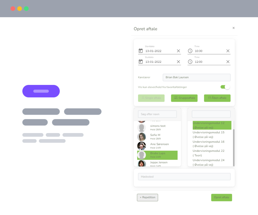 Ét komplet system, der samler alt det vigtige: elever, booking, kalender, betalinger og digitale lektionsplaner. Resultatet er mindre bøvl for dig – og en bedre oplevelse for dine elever.